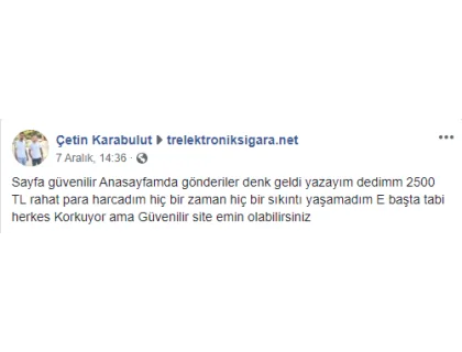 Kısa bir özet geçeyim.. 1200₺ lik bir sipariş verdim korkarak tereddütle ama 2 gün sonra elime ulaşan kargo ile güvenilirliklerini kanıtlayıp korkularımın yersiz ve gereksiz olduğunu gösterdiler. 1 haftadır sigara kullanmıyorum Harika! Teşekkür ederim.. Herşey mükemmel. Ürünler tam, iyi paketlenmiş ve Orjinal barkodlu ürünler... fiyatlar gayet iyi. Gözünüzü Kırpmadan alışveriş yapabileceğiniz sitelerlerden ilk ikiye girer hattan en iyisi diyebilirim. Müşteri hizmetlerinden, Sabırsız ve fevri bir karektere sahip olmama rağmen memnun kaldım.. adamlar memnun ediyorlar abi işlerinde çok başarılılar.. umarım en kısa sürede bir yıldız gibi parlar ve hakettikleri yerlere ulaşırlar. Allah dürüst esnafa yardım etsin böylelerini korusun... fazlasıyla iyiler. Hızli ve guvenli alısveris özelliklede müşteri hizmetleri için.. artık tek favorim TrElektroniksigara.. Teşekkürler..