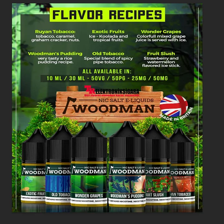 Woodman, Birleşik Krallık (İngiltere) menşeli premium aroma ve likit markasıdır.30ml standart ürünler olarak beğeninize sunulan bu ürün grubu, 50VG-50PG kompozisyonu ile tüm pod cihazlarla Kullanıma uygundur.